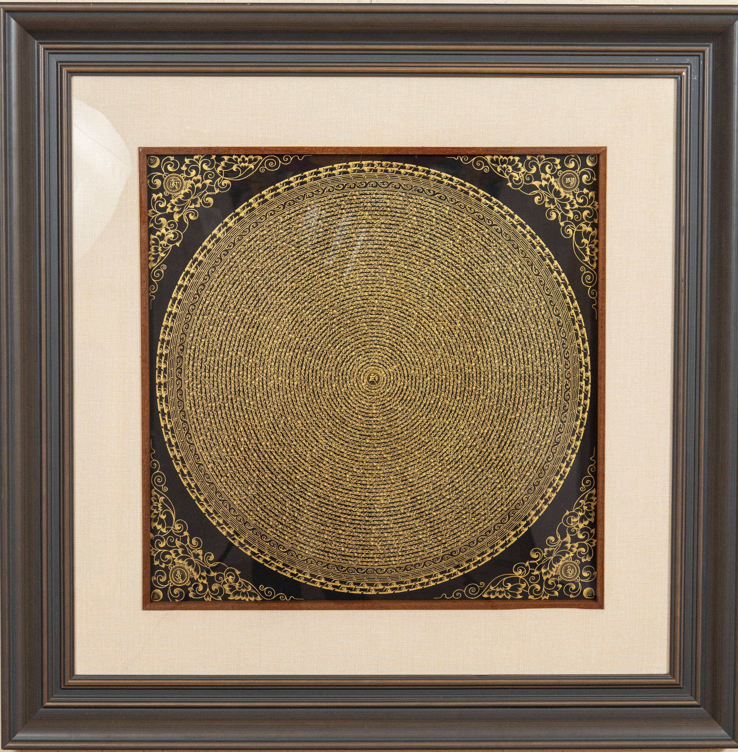 这件书法作品以纯24K金书写而成,将黄财神心咒与《般若波罗蜜多心经》融为一体。圆形坛城构图象征圆满与法界一体。画面中央为黄财神心咒,代表清净发心所生的福慧资粮;环绕其外的《心经》经文,展开空性智慧,揭示真正的财富须以正见为基。金色经文在深色底衬上层层铺陈,字字相续,排列严谨,展现专注与禅定之功。整件作品体现了藏传佛教「福慧双修」的核心——福德与智慧的合一。既可作为修行所依,亦为静观之对象,是一件具有高度精神性的艺术珍品。