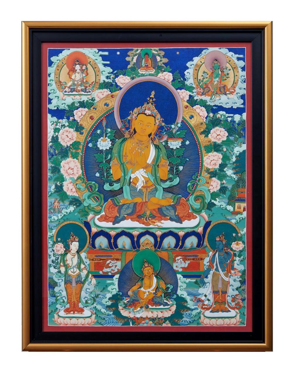 本次展览展出六幅唐卡作品,分别为:文殊菩萨、大行菩萨(或大行普贤菩萨)、绿度母与二十一度母、白度母,以及大威德金刚。所有作品均来自本次展览策展人——Pure Stone Global 的邱珍宝女士的私人收藏。唐卡是藏族文化中一种独特的绘画艺术形式,被认为能够向人们传递和散发能量。它具有鲜明的民族特色与独特的艺术风格,以明亮的色彩呈现佛国圣境。其颜料传统上均采用金、银、珍珠、玛瑙、珊瑚、松石、孔雀石、朱砂等珍贵矿物宝石,以及藏红花、大黄、蓝靛等植物,以彰显其神圣性。